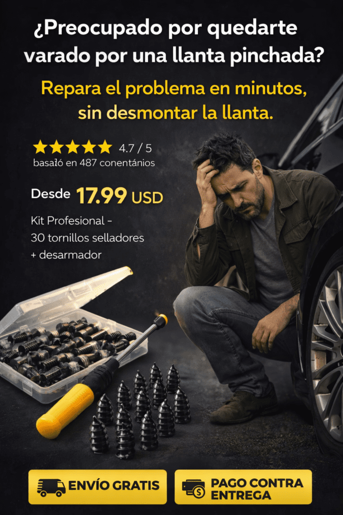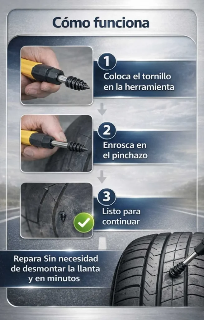 Un simple tornillo o clavo puede arruinar tu día y dejarte detenido en la vía. Con el Kit Tornillo Despincha Llantas, sellas el pinchazo al instante, sin desmontar la llanta y sin necesidad de pegamento.